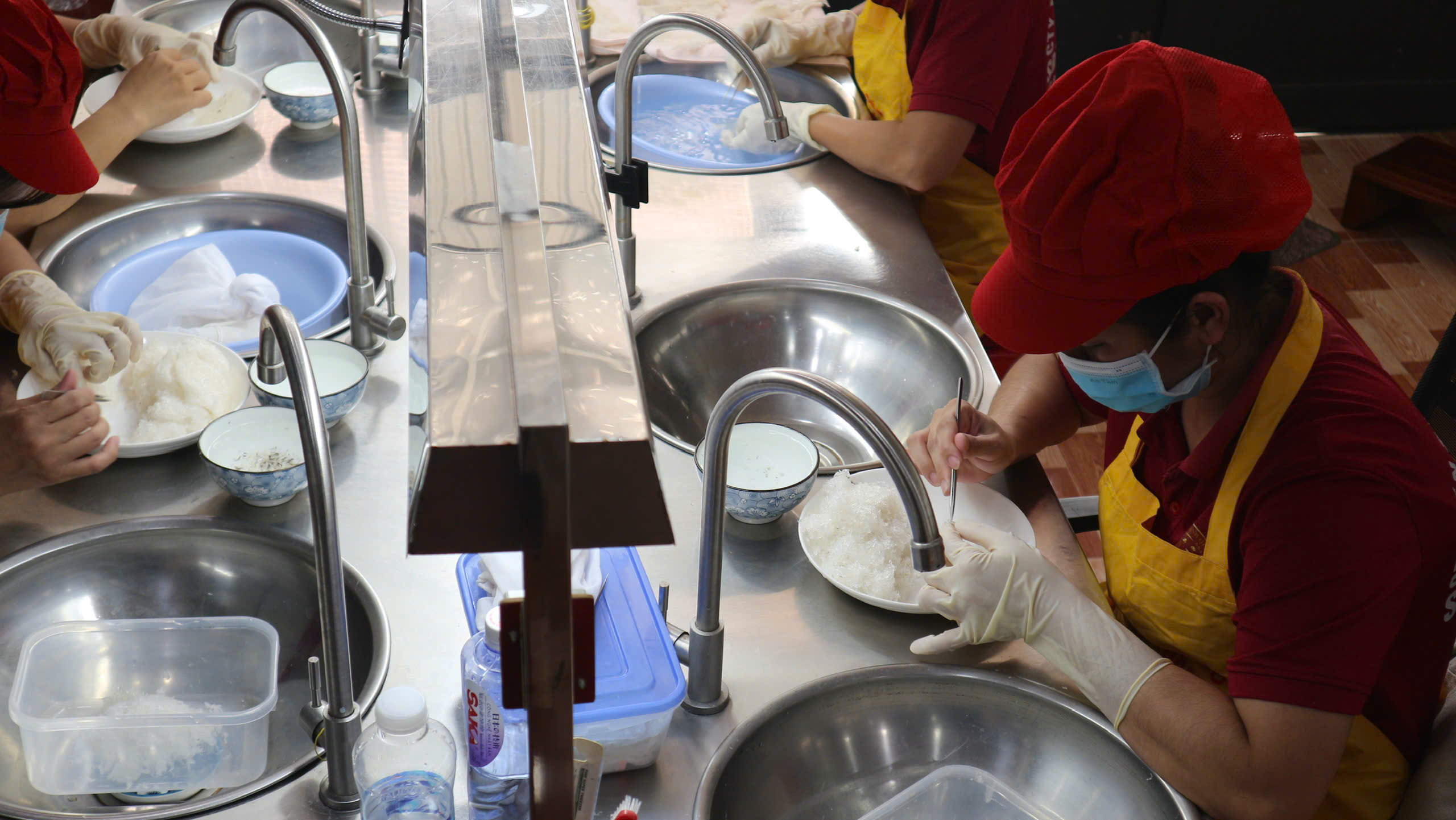 Quá trình làm sạch được thực hiện hoàn toàn bằng tay bởi đội ngũ nhân viên giàu kinh nghiệm, dưới ánh sáng tốt và dụng cụ chuyên dụng. Mỗi sợi yến được gắp lông kỹ lưỡng, không sử dụng chất tẩy.